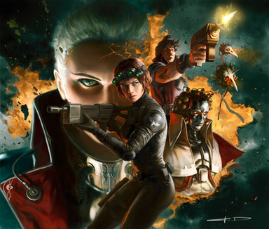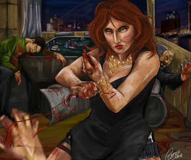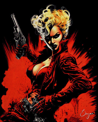 Painted in Photoshop CS3, Intuos 3, many many hours.I wanted to give the whole image a threatening vibe with the guns all pointed towards the shadow of her head and the hydrangeas emulating blood (or brains?