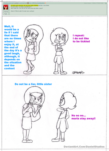 ESPAÑOLBueno, aquí esta la primera de las preguntas, las iré respondiendo según el orden en el que llegaron, se imaginaran que verónica no pretende responder preguntas relacionadas a las cosquillas, por suerte o por desgracia, a su hermana no le gusta dejar preguntas sin responder