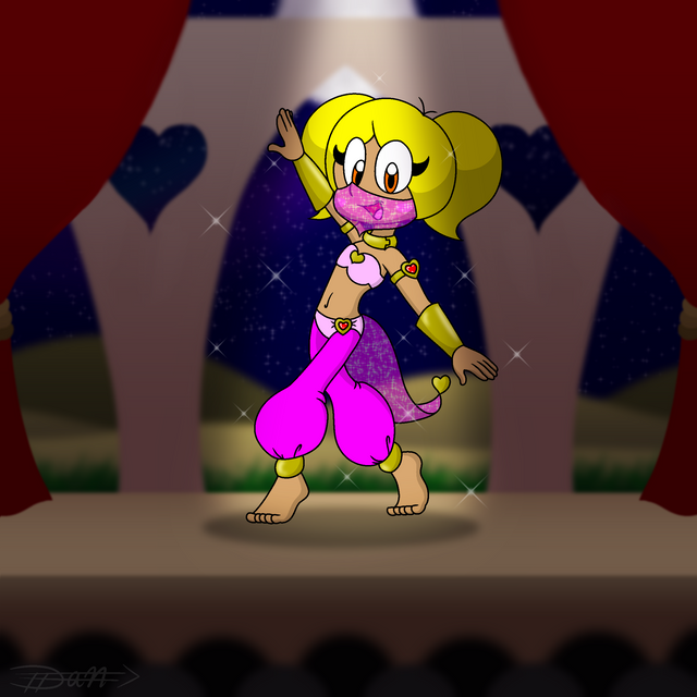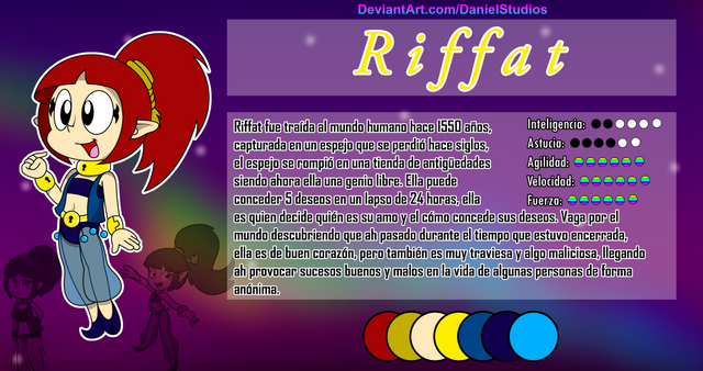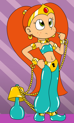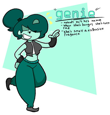 Caught in a bronze oil can 1500 years ago, Ribon is a powerful genie, whose prison is owned by a young inventor named “AB”. She has the ability to grant unlimited wishes to the owner of her oil lamp, however, she almost always has the option to refuse, and how they will be granted depends on how she interprets it. She currently lives fascinated and confused by the modern world, has a great taste for pineapple and cold foods and usually behaves and plays like a girl almost alway
