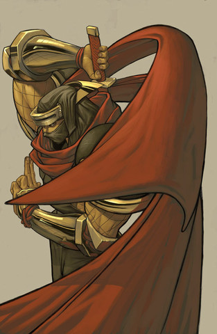 Beautiful rendering on his helmet. ^_^ If I didn't look closely, the how figure looks like one big giant arm too me too. O_O That is an interesting composition.