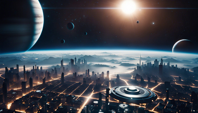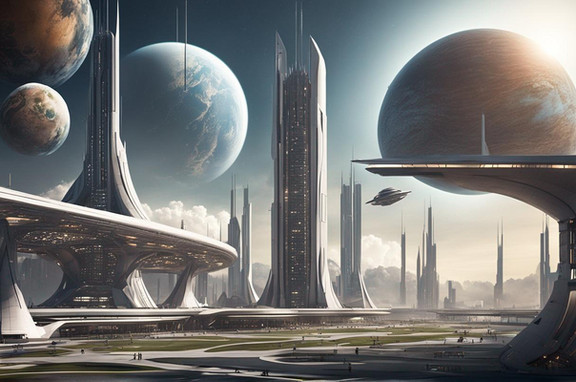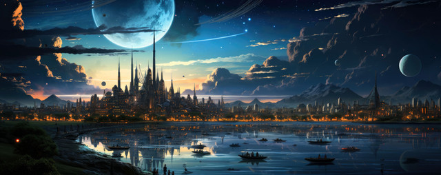 In this futuristic artwork made by me with AI, you see my Imagination of a Future Town, where the skies are always clear, and the planets are always in plain sight.Please, kindly note: I do not use any ART-WORK as a reference to create my AI-Art. I use my imagination and well spent effort to develop my AI-Art. My results are based on human design thinking and decision-making.
