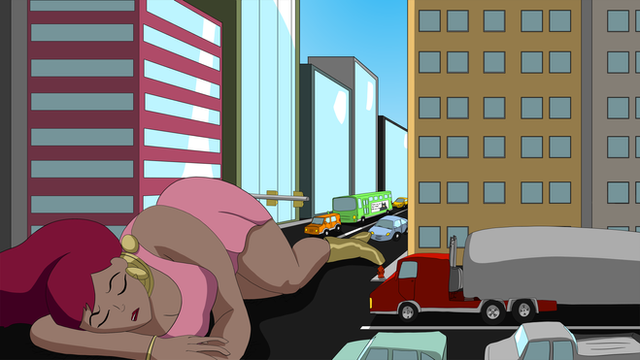 can you make a pic of giant Jess sleeping while people exploring her beautiful body please.
