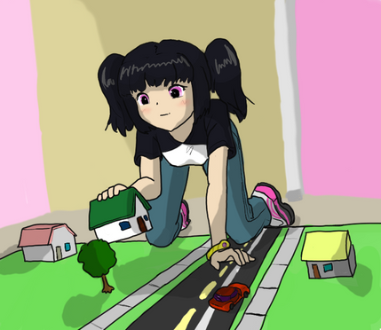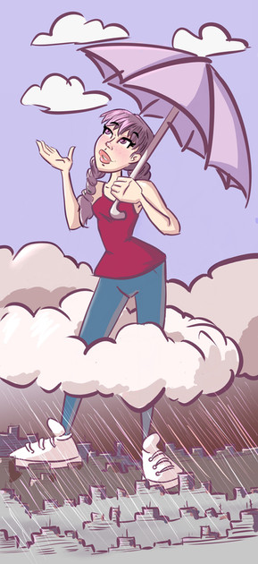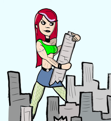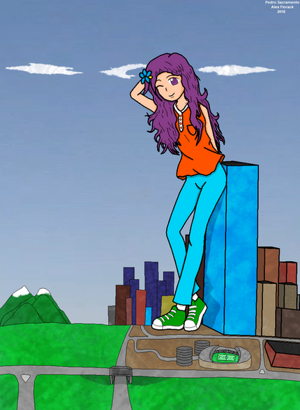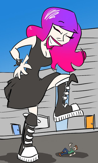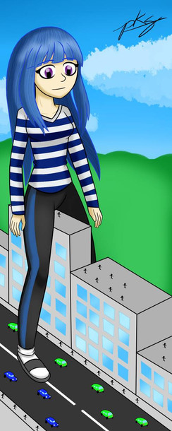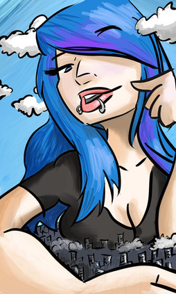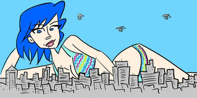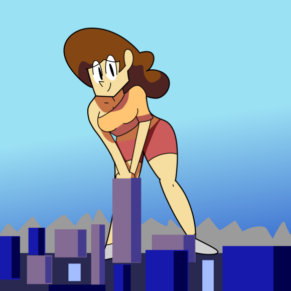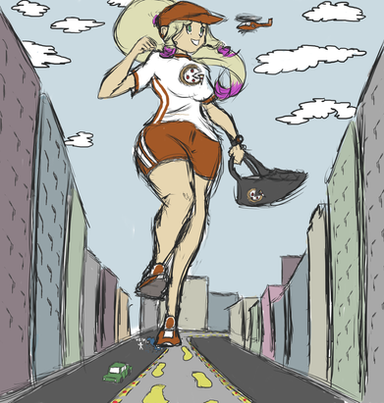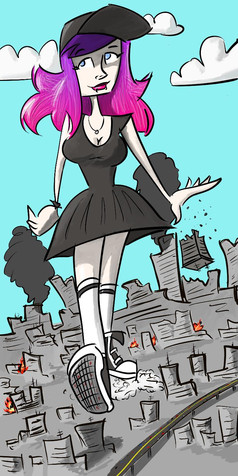 Doing what a girl does, the gorgeous giantess goes for a walk listening to her music, so happy singing along to it. What is bad for her surroundings is she is large and does not care about where she is walking as she crashes through the buildings, in fact the sensation is all rather awesome as she happily strides through the city, life is good. Great drawing and colouring.