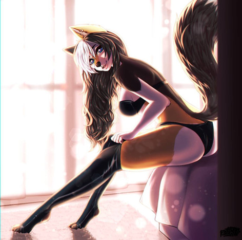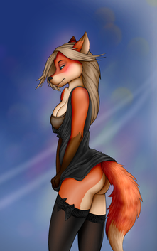 as usual you two did a fabulous work! heh she's very very pretty! Β the pose and the body are sensual and sexy! the big and fluffy tail is super nice! I like the long hair and the cute muzzle! her eye is also very pretty! and of course that's a super cute booty! the coloring job and effects are great! awesome pic!!