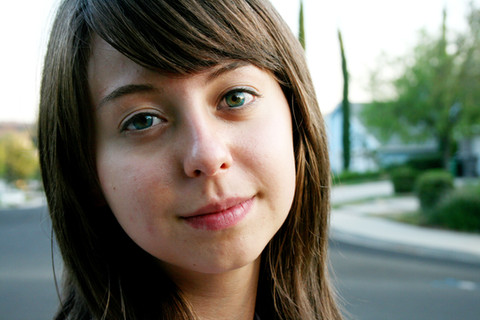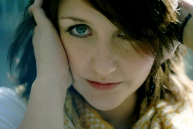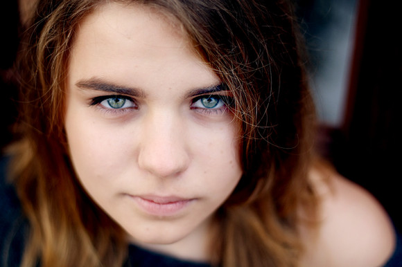 This shot is interesting in so many ways. Her lips pressed together just a little -- not quite sure of herself. The color of her eyes are amazing. The shallow depth of field makes her face really pop out at you. The framing and shadows are perfect.