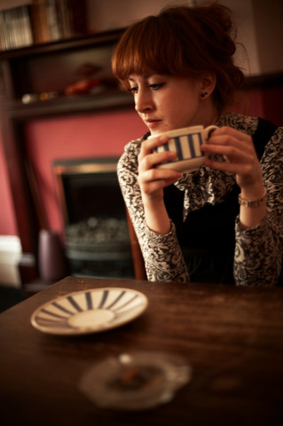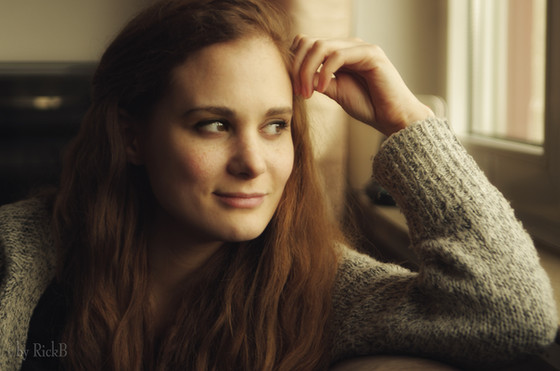 So the first thing my eyes were drawn to, was her eyes, gazing off into the far distance. Her expression suggests many different potential trains of thoughts going on in her head, such as longing for whatever may be outside, or perhaps a simple desire for the rain to stop. What I really appreciate about this picture, is that the model is fully clothed, which, in my opinion, brings out her beauty far more than if she had just been in her underwear or whatever. Her pose looks like she might have just woken up, and drinking coffee, or maybe that she is relaxing and enjoying a nice cup of tea after an afternoon full of gardening. You did a fantastic shot of the model, striking a nice contrast between a detailed subject and a vague and blurred back drop.
