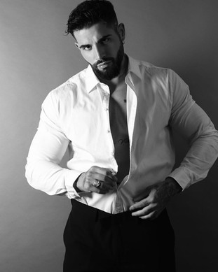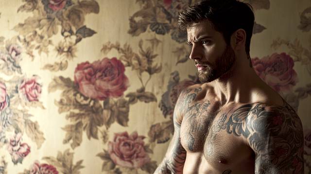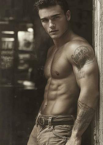 The color choice is good as the place is good to. I like how he looks the camera, it's a little bit wild and his muscles and tattoo reinforce this effect.