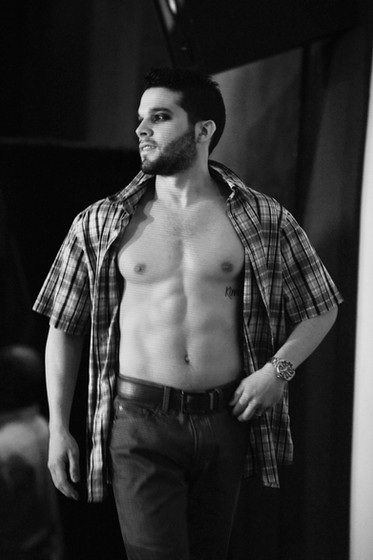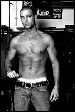 My only real complaint about this piece is the lack of contrast. Your model has a wonderful body and there are some interesting planes and valleys on his body. You have patches of hair, a stunning blend of sexy curves and hard planes but they seem to all blend together because of a lack of contrast to bring those things out. Black and white shots are tricky because they can do just that. If this shot were hit with a few blasts o' contrast, the man's wonderful details would leap out of the shot.