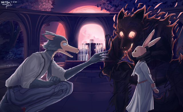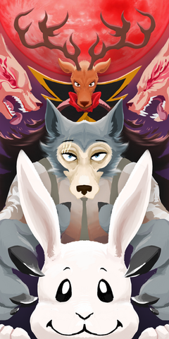 Gosh I love that composition, especially with how Haru and Legosi are perched on Louis's antlers, while Legosi's carnivore shadow is displayed on the moon.