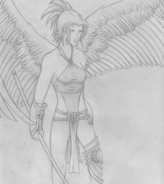 Another one of my favorites! This one took me ages to finish due to the amount of detailing on the wings as well as the general design.Essentially, this one was part of a series of sketches where I made up characters who were wearing animal "costumes" (there are 2 more, 1 with a lion and the other is a goat). Anyways, it's sorta like how Shamans would wear the skin of lions and stuff. In this case, she wore the "skins" of a giant raven. Anyways, this picture is pretty old (2003) so the *technical* stuff may not be as good as some of my newer pieces (the outlines of certain places where it should be dark - my art professor totally bashed it, calling it the "halo effect") and a slightly awkward arm. I just love this piece mostly for the design elements.