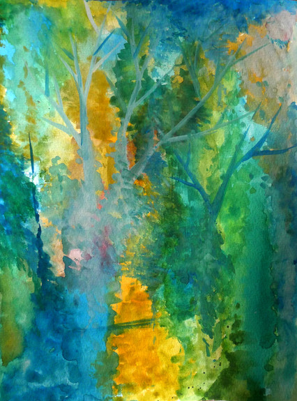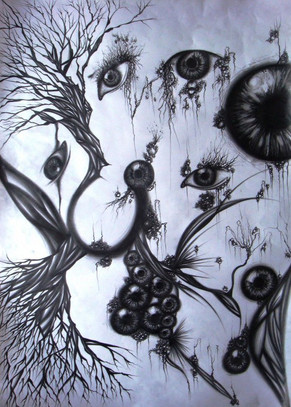 the vines with leaves coming down with her hair are wonderful. It's a very nice touch that these straight lines are repeated elsewhere, like off the top tree, the bird's chin and the other bird's torso. THey look almost like they're made of a sticky gelatinous substance and could lose shape at any moment.Β