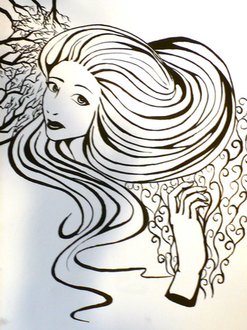 this is incredibly beautiful! I love the curving lines and the golden color all over it; the faces are very dreamy and doll-like; the fish looks like it's wrapped in lace. It's very pretty
