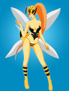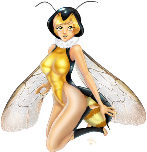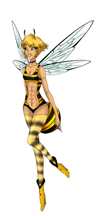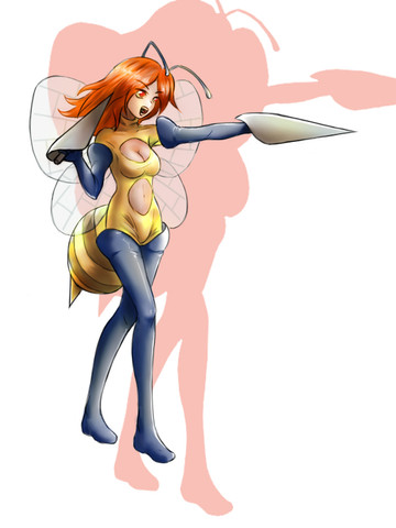 Very cool looking character, part insect, part human, though not exactly what I'd call an anthro. I think she's got both long range and short range attacks covered here between her bow, and her bee stinger.