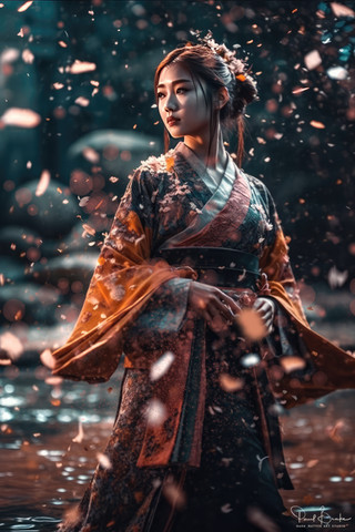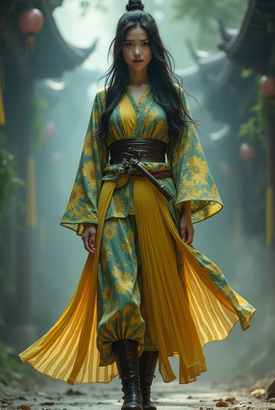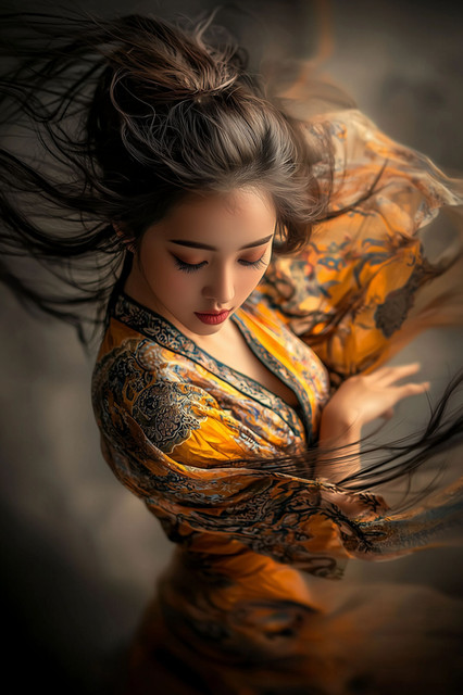 #gold #movement #stairs #wind #backlighting #brunette #fashion #flowinghair #goldenhour #scarf #temple #brunettebeauty #blowingskirt #ai_artwork
