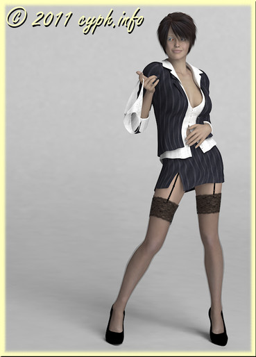 Looks both very british, and hell - pretty kinky costume to hide underneath that blazer. Nice way of presenting her, too, in the photo studio - a pretty unusual way of a presenting a picture. Her legs do seem to just kind of "pop out" from her pelvis, though, there doesn't seem to be much i the way of bodily flow in that.