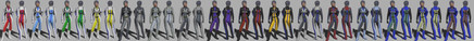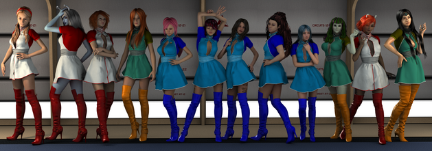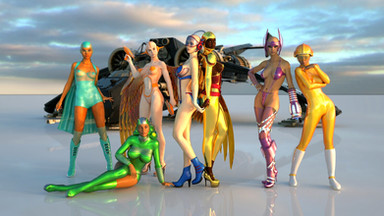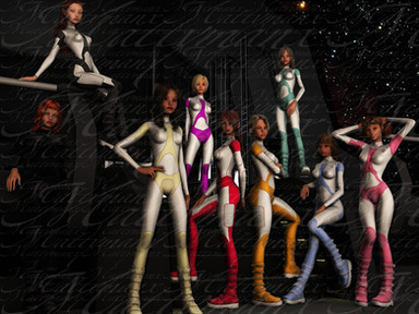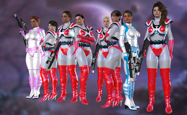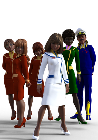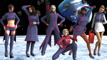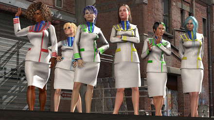 An update of the Macross pic at [link] , now with all of the correct uniform colors in place. Gave blue skirts to the female pilots to match their shirts, the way the male pilot uniforms match. The Macross character designer’s illustrations indicated that he was going to do that as well. Updated morphs for all the characters, except for the blond to the left. Made the lighting of the back alleys look more alley-like. Added subsurface scattering to the hair to see what would happen. Gave the dynamic clothes new simulations, though these are the same old low res versions that yield low-detailed wrinkles. Still closer to what I was going for, though.Poser Pro 2012, Photoshop to edit out odd splotches due to Poser’s handling of indirect lighting. There are things about the old clothing shader Poser doesn't like, and keeps giving me moiré patterns.