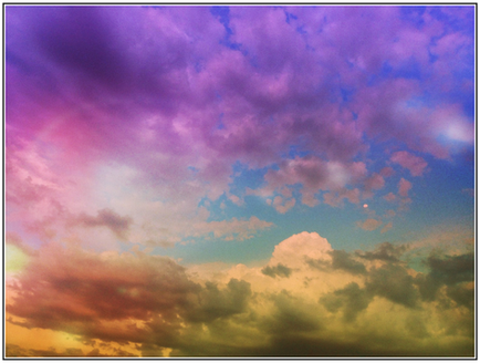 i like the horizon line where it is, i always enjoy sky shots. the border works well with the piece. the dark area at the top left is a lil distraction, but other than that you did a good job