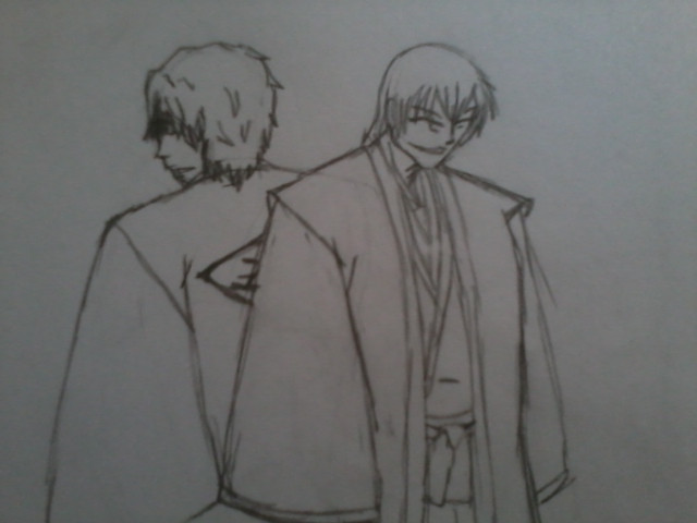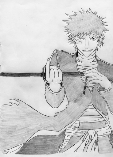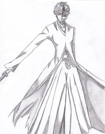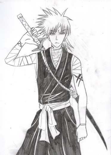 What you can't really tell from this, though, is just how close to the edge of the paper Shiro is. I accidentally drew Ichigo too close to the middle of the page instead of off to the right more. Consequently, the reference picture I was using for him had his right hand going off the edge of the paper. For obvious reasons, this was a bad thing. I tried to look up a second reference picture for him holding his arm up more, but eventually I just free handed it with no references. I also free handed both of his hands (I used my reference pic for Ichigo's).