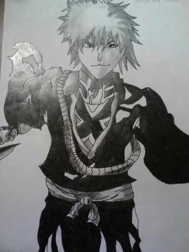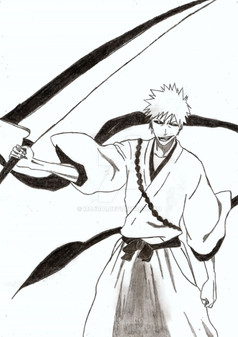 A Shinigami's Spirit Thread is red. A Vaizard's is...The original idea I had for this was Ichigo holding a red Shinigami thread, Shiro holding a black one, and the resulting mix looking something like the bankai Getsuga Tenshou: black with red edges. But, you know, that requires color. I may color this eventually, but for now, I kind of like the contrasts of the black and white.