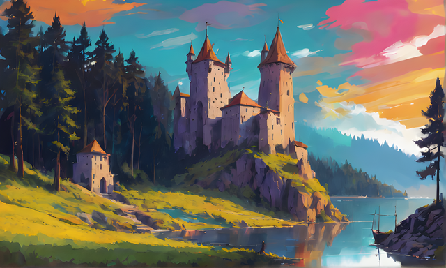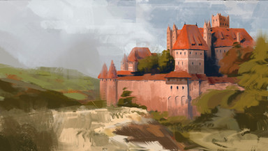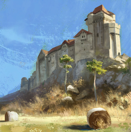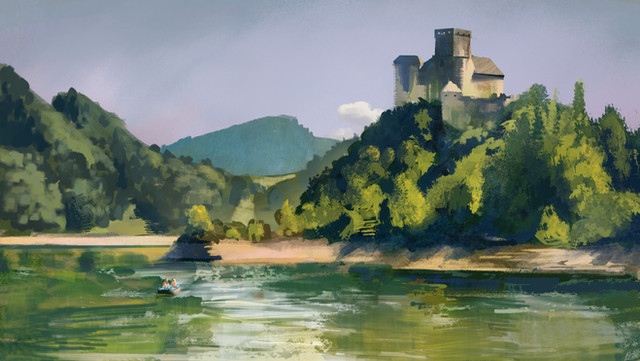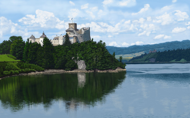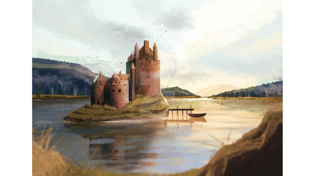 #blue #castle #drawing #fort #hills #island #medieval #nature #painting #realistic #rocks #scenery #sea #sky #study #trees #water #daripo #dariumi