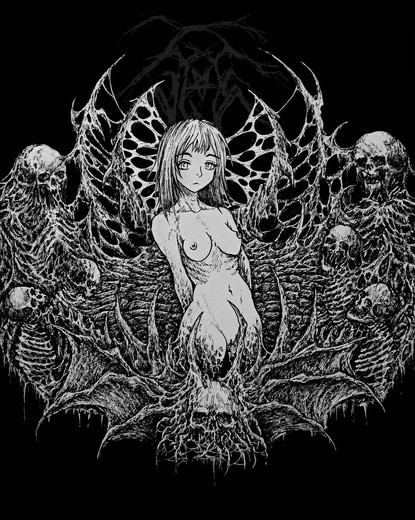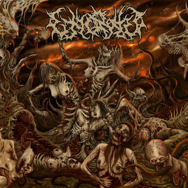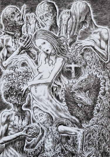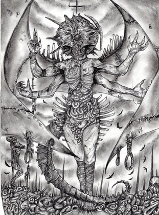 Do you know that Vincent Locke is my absolute favorite artist in the world, right? Well, I made this, inspired in the brutal cover of the Cannibal Corpse's album The Wretched Spawn, that is my favorite album cover of them. In my own version, two women have given birth to the children of the devil. Necrodevourer is ready to eat the sons of the devil (they will give him eternal life), and a monstrous demon is behind, raping an unfortunate woman that is looking upward, praying to heaven for mercy...