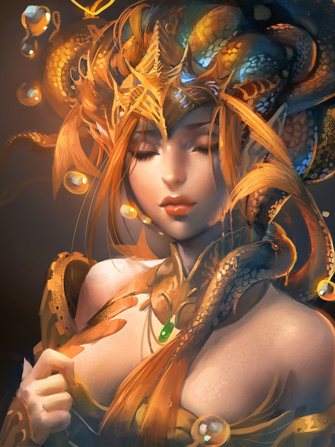 Loved how the colors of blue, green and yellow, build the texture and the details of the water. And then it disintegrates and the doll is right there with the snake enrolling her. It's just... awww what a feast to my eyes!