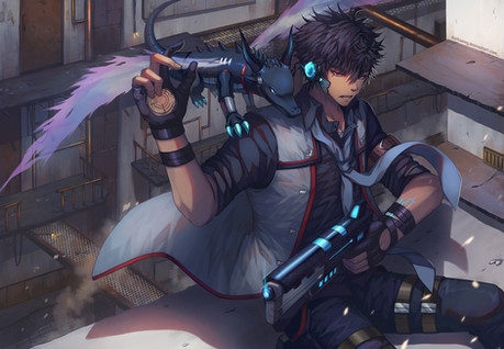 Omg, your art never fails to take my breath away. Character and coloring are stunning, as always, (look at his smirk!) and the bg is fantastic. Your nature bgs are amazing, but I feel like your cityscapes and technological bgs are your best.