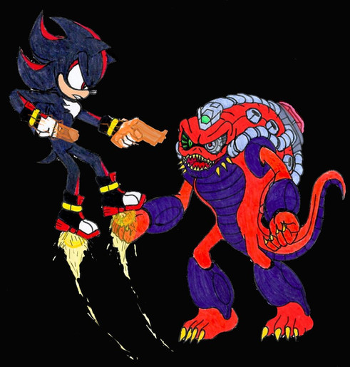 Shadow versus the alien! I like this piece! Shadow looks like hes about to pound the shit out of the alien. I also like hopw you did the shoes! Me rellly relly like this.