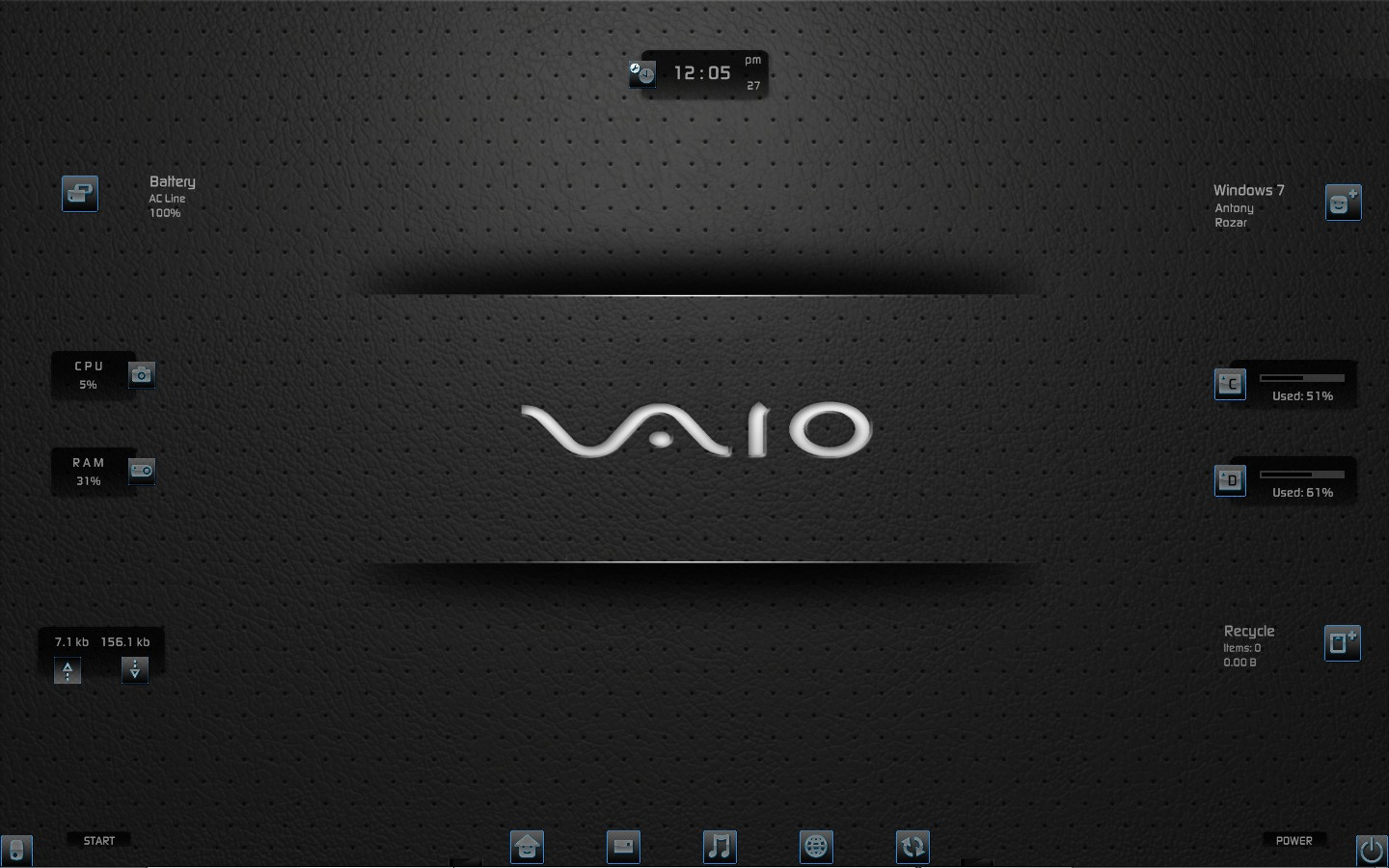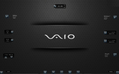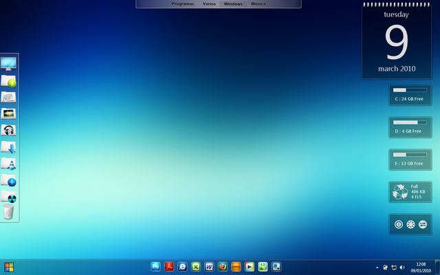 My Computer, Documents, Music Player, Browser, Recycle Bin, iTunes Player, Pictures Slider, Movies, Music, Icons, Pictures, Cpu, Ram, Disk c & d, Battery, Trash Network upload & Download, Ip Address, Date, Time, Weather, System info, User Info, Uptime, Power Info & Options, Start Menu, ....