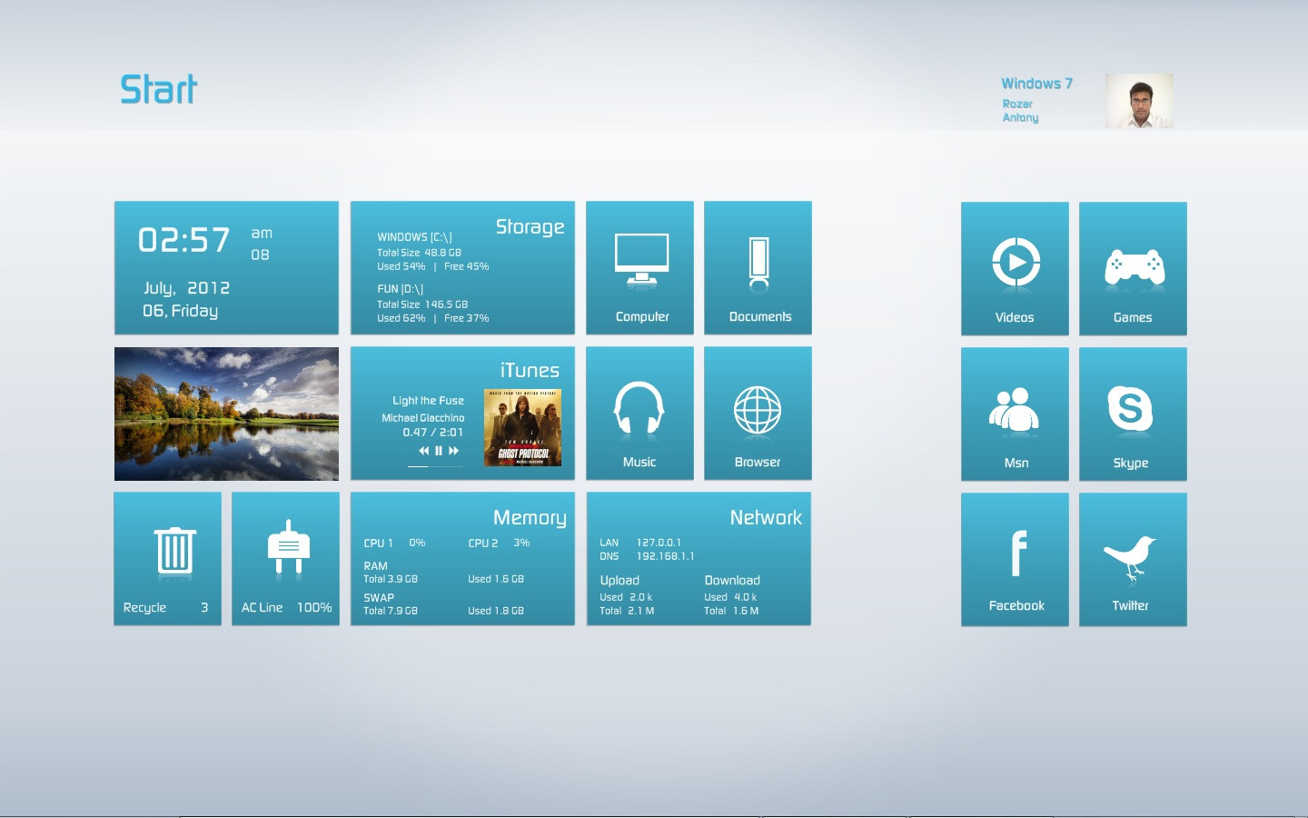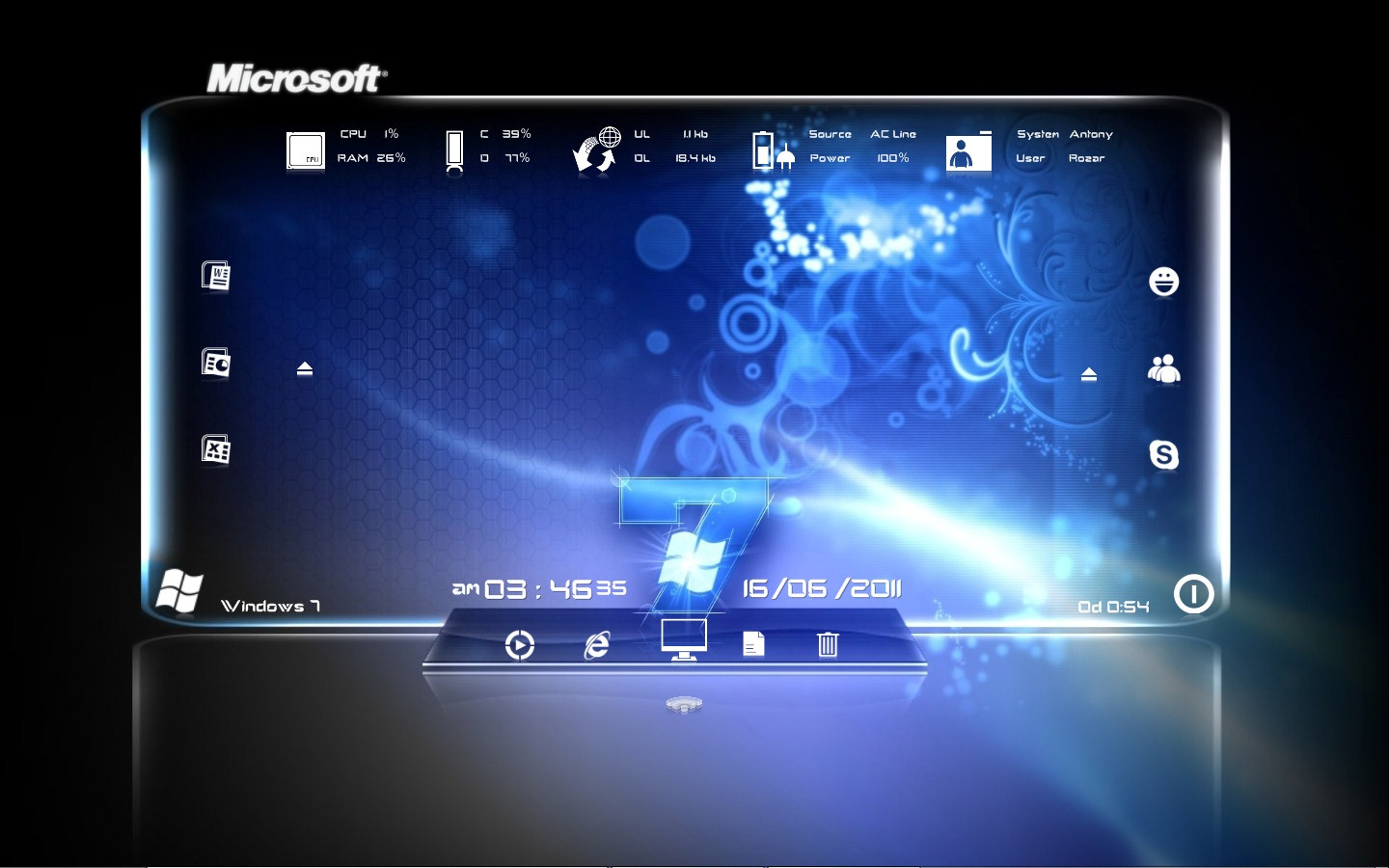 My Computer, Documents, Music Player, Browser, Recycle Bin, Cpu & Ram Meter, Disk c & d, Network upload & Download, Date, Time, System info, User Info, Power Info, Uptime, Shut down, Os Info, Start Menu, Microsoft Applications, Chatting Applications....