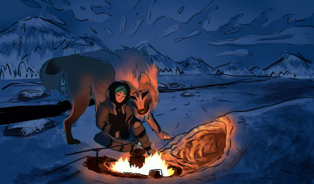 Tannor decided the best way to a wild Toko's heart is with food, lots and lots of fish. Arrluk is not unhapy with the offering but she's still on edge.