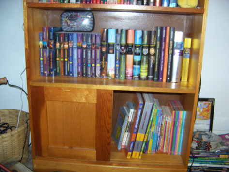 I have a giant collection of books and other things, here is a list of what everything is in ths picture:Bottom shelf: