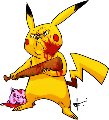 I don't hate pokemon, but im pretty upset that the games and TV show were toned down for us "sensitive americans". I even heard that the first pokemon movie was much more grafic and viloent in the japanese one than the poor excuse they gave us americans. But the artwork is a diffrent story, if you draw pokemon, expect me to come and land at the nearest LZ for a while. People often draw pokemon in the way we want to see it, like this pic for example.