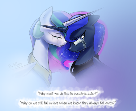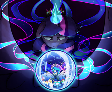 Twilight was never quite the same after the wedding. Her encounter with the changelings and their queen made her... curious. She delved into the darker tomes of the Canterlot Library, looking to find anything to improve her magic ability. She and her friends had been defeated by the changelings, and Twilight resolved never to fail them again. She learned that magic isn't always fueled by harmony, that greater power awaited should she reach out and take it. Starswirl had called it sorcery, depicting it as unclean and corrupt in his research. Twilight saw it as an opportunity. With her findings, she found how to turn any powerful emotion into fuel for her magic. Nightmare Moon had used her jealousy to become more powerful than Celestia. Discord used his pride, and Chrysalis used the love of another. Twilight used her ambition. She became powerful. Powerful enough not to fail again. But in doing so, she had distanced herself. Her ambitions grew with her magical prowess, eventually causing her to snap. Keeping herself from failing wasn't enough. She resolved to purge everything that would threaten her friends. Things like the changelings, or the more malevolent dragons. It wasn't long before she was out of control completely. Driven to purge threats, she started attacking lesser threats. Griffons became completely nonexistent, and the Everfree Forest was wiped from the map. She even turned against other ponies. Trixie and the FlimFlam twins never stood a chance. Celestia tried to step in, to stop her student from her madness, but the student had surpassed the master. Even the alicorn couldn't stop Twilight from her goals. The throne was empty, but Twilight soon fixed that. She took it upon herself to rule, and turned the land into her empire. Those she deemed 'safe' only held their position until she saw them as a threat. Nopony was safe from her paranoia.