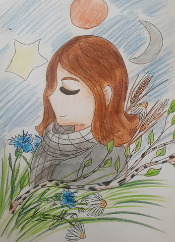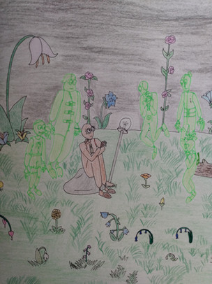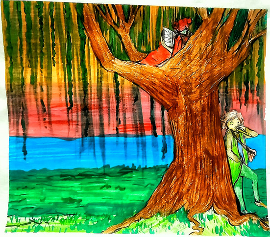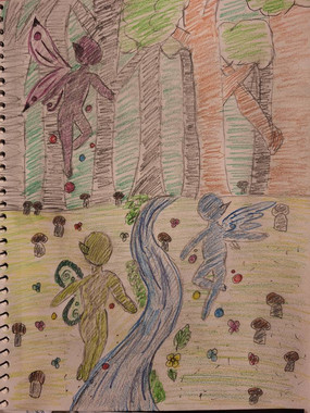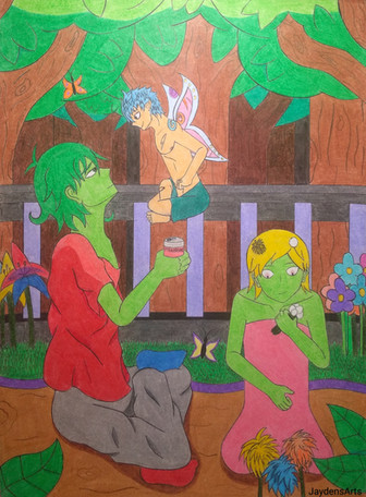 This came to me just now. It took almost the whole day and I'm just glad I got it done.In the picture is 9 sitting on a log watching a butterfly. Joining him are 5 and 6. I drew more trees than I'm used to, but I wanted to challenge myself.