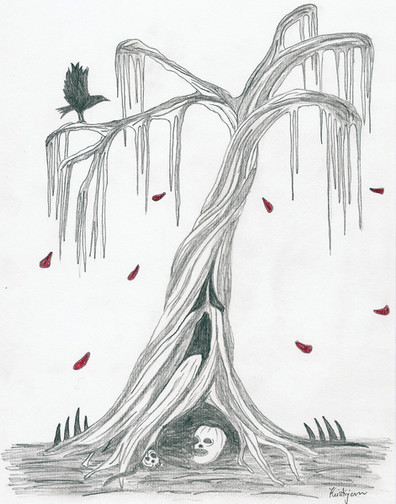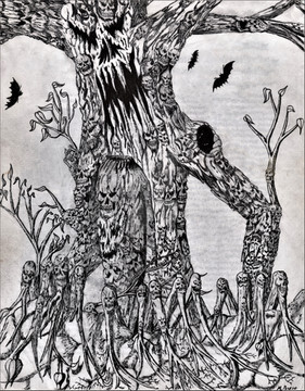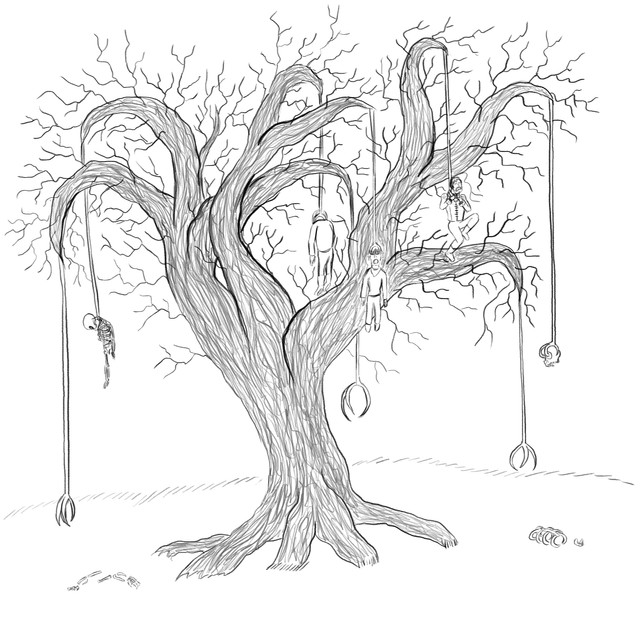 drew a tree that grows nooses instead of leafes ?!?got the idea from brutal legend 's level regrets Invinitive Mire. In the level are nooses hanging from tree's to help those wo get lost in the swamp and want to die by their own rather then by the creatures of the swamp.
