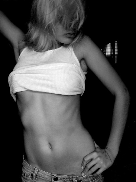 This shot is excellent. The first thing that got me was the lighting. It looks like it's natural light, although I don't know if you were using lamps or not, but you created an excellent effect. The shadows across her stomach highlight her slight muscles there, and her unmistakeable belly ring. Great choice of clothing as well...the shirt looks great in the lighting situation. I can't forget her expression, of course, her eyes are extremely intense, as if she's watching the viewer's every move as she takes off her shirt. Again, great shot, very well done.