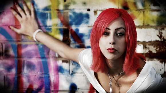 great shot, the red really has great contrasts agains the muted colours of the wall, and lovely eyes...though I like the slightly windswept hair, very cool