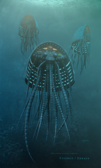 Wie die Maschine aus diesem wabbernden gelblichen Dunst aufsteigt und zu einem klaren, Ästhetischen Konstrukt wird...ist beeindruckend. Auch, wie du gegen die Wuchtigkeit und Größe der Maschinen diese filligranen blauen Licht(/Laser/wasweißich)strahlen setzt, ist wunderschön! An dieser Stelle hat das Bild auch etwas zerbrechliches, etwas endliches. Dennoch strahlt alles eine gewisse Gefahr aus...ich weiß nicht, warum ich das so fühle, aber ich nehme an, dass es durch die totale Leblosigkeit des Bildes kommt. Die einzige, angedeutete bewegung neben dem zerbrechlichem Licht(/Laser/...)strahl ist der Dunst unten, und der ist auch nicht gerade Vertrauenserweckend.