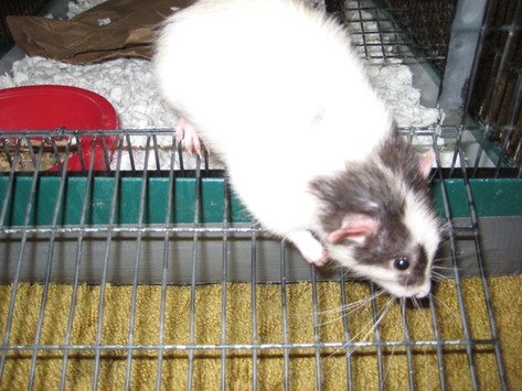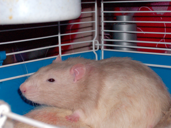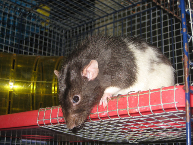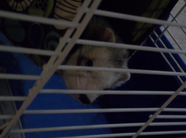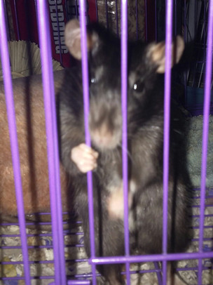 So darkened convinced me to take a picture of my rat I had gotten (made a journal about it last year) and here he is, almost a year old! He was about 5 weeks old when I got him so he'll be a year towards the end of May or sometime in June. That is paper bedding, blue and purple, the purple is only there right now because that was what was left of the previous bag, so I added in the blue, which is our new bag, to make it colorful lol