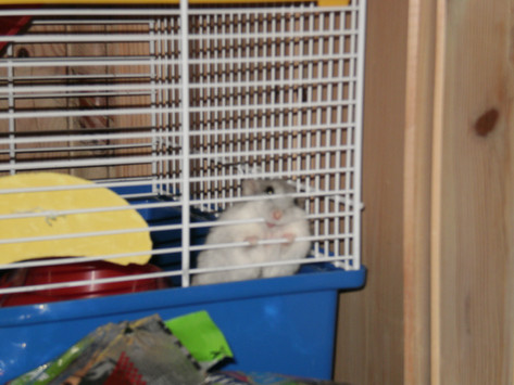 And in case you're wondering, that thing you see by his ear in the bedding is his mini treat stick (that is more rectangle shaped) and its golden honey flavor, he loves it, and he only gets one once a month so I have to make sure when I clean his cage each week that I'm not throwing it away. There are two more levels in his cage (hence why you see no bowl or water bottle, they're on the second levels) and he used to have a twine ball in there, but he tore it to shreds and made a nest out of it, which I accidentally tossed in the garbage so I'm working on getting him a replacement twine ball, as well as some more stuff in his cage.