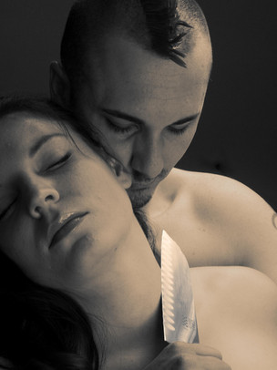 Hmm. I agree with a previous comment, her hair needs some work. It detracts by being the only non-solid form in the image. I've never seen someone trying to push a knife away, but I think the male could do with more tension in his arms and chest. But you sort of have a serene feeling in the image, despite the image itself. So, I don't know...