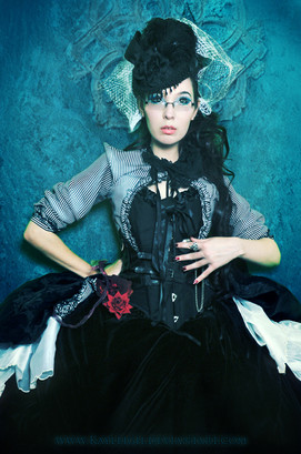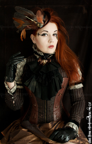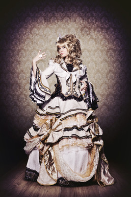 Styling, clothing, hair - all very well done. Great color scheme, I love the pearls and the gold along with the metal headgear.