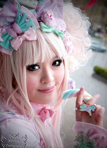 We used some cream/sprinkles/strawberry as a fascinator, then just let rip with a fair amount of strawberry and chocolate sauce and loads of bags of sweets right over her head.... (something I'm sure most loli's would faint at the mere notion of!