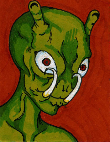 This is a watercolor painting of an alien departing from a bizarre brain-like spaceship.