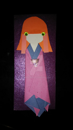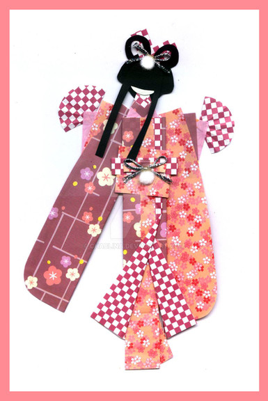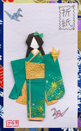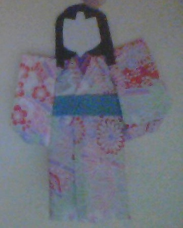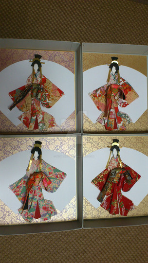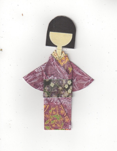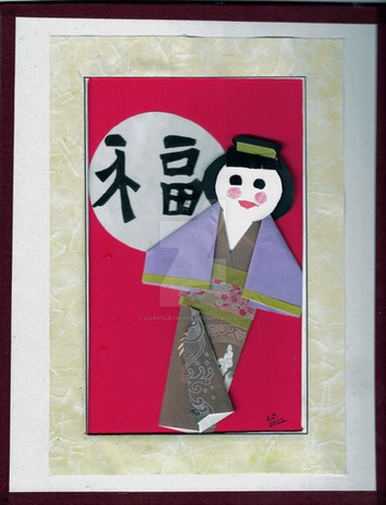 This is a Japanese inspired origami paper doll is adorned with a kimono outfit standing before the Kanji characters for "Good Fortune" that I just finished making. Paper dolls have a long tradition in Japan. The art of making paper was introduced from China to Japan around 6 AD and paper dolls came into being in Japan in the 1500’s. The first paper dolls were mainly fetish spiritual idols or children’s toys and later became more decorative objects. The dolls typically portrayed different aspects of life.