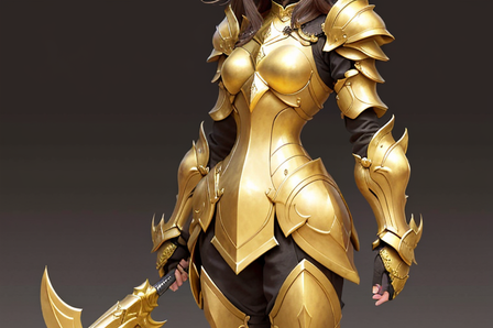 character stats sheet design for sci-fi fantasy armored gunsword with shield in gold!!