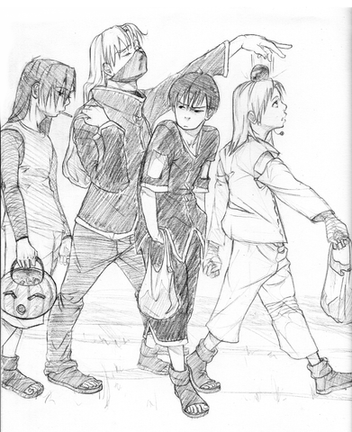 Oh, yeah, they stand like that for a reason. As much as I wanted Sasuke to be in profile, that would mean that he, like little Naruto, looks forward without hesitation... and the only thing before him is darkness. For him to be standing off like he is would suggest some hesitation pursuing either path, but looks forward anyway since that is what he chooses over the bit of light. And, of course, his buddy stands unwavering, because he is sure of the path he takes. Yeah >>