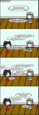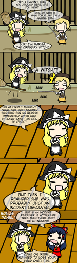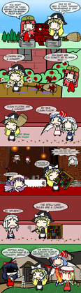 The obligatory "I'm not dead, just lazy/tired/lacking motivation/lacking inspiration" is probably getting old, so I don't think it's going to be so obligatory anymore. Technically this is a day late, but the previous prompt was "Magic". I initially thought that magic would be way too broad an umbrella, especially for Walfas, with its roots in Touhou. The place is positively dripping in the stuff, so I took a more generic meaning to see if I could pin something specific down, which led to this, a comic about magic tricks (emphasis on trick).Paneling it like this gives more freedom for the bounds of individual shots, and they frequently take less time to set up than a bunch of horizontal, full screen width boxes. The trade-off comes in the strict structure of line breaks. For example, I originally intended to simply have Marisa look worried in the same panel Reimu exposed her scheme, but because the last panel takes the full width, I needed to separate Marisa's expression into another shot to fill out the row. In hindsight, I could have tried to work with rows of uneven lengths, but I'm not sure how good that would end up looking.