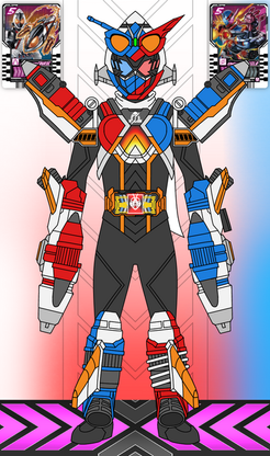 FlyingFirework Form is an cerulean and red Best Match form accessible with the Tobiuo and Hanabi Fullbottles, hence known as the Water Jet of Liberty (自由の水噴流 Jiyū no Mizu Funryū). It is themed after a flying fish and a firework.